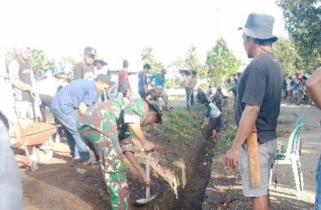 Warga bersama anggota Koramil tampak kompak bahu membahu membersihkan saluran air yang penuh ditutupi tanah lumpur dan sampah yang mengganggu aliran air tidak lancar
