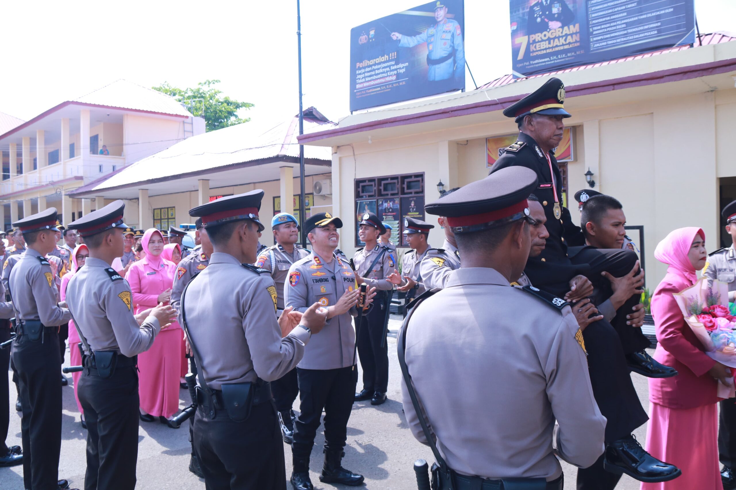 Di hadapan keluarga, rekan kerja, dan Pejabat Utama (PJU) Polres Sidrap, Kapolres Sidrap, AKBP Fantry Taherong, memberikan penghargaan setinggi-tingginya kepada personel yang telah mengabdi dengan penuh Integritas dan Dedikasi selama bertahun-tahun.