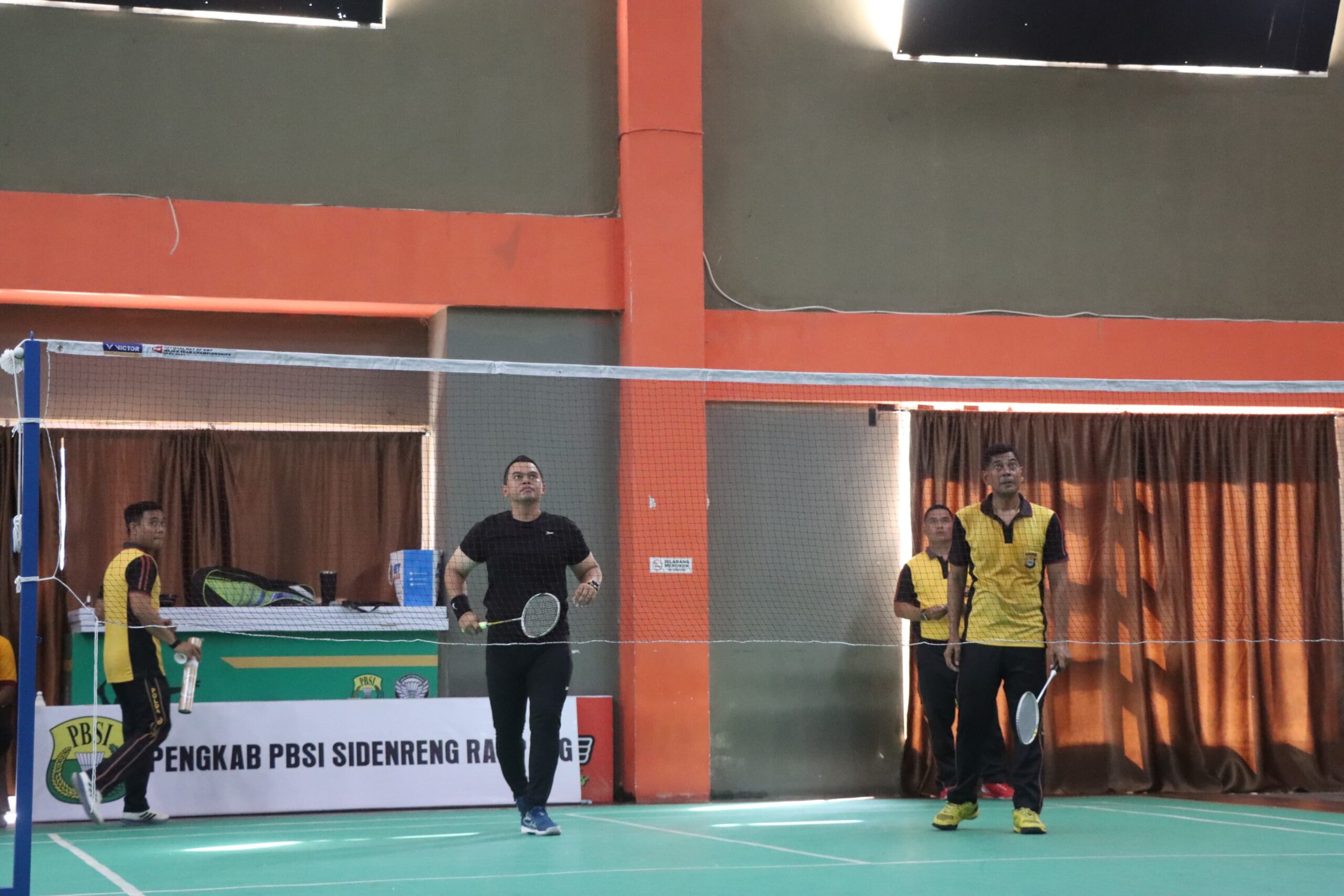 Kapolres berpartisipasi dalam pertandingan eksibisi bulu tangkis, menunjukkan semangat kebersamaan dan dukungannya terhadap olahraga. Kehadiran para pimpinan ini menambah semarak acara dan menunjukkan sinergi yang kuat antara instansi-instansi di Sidrap.