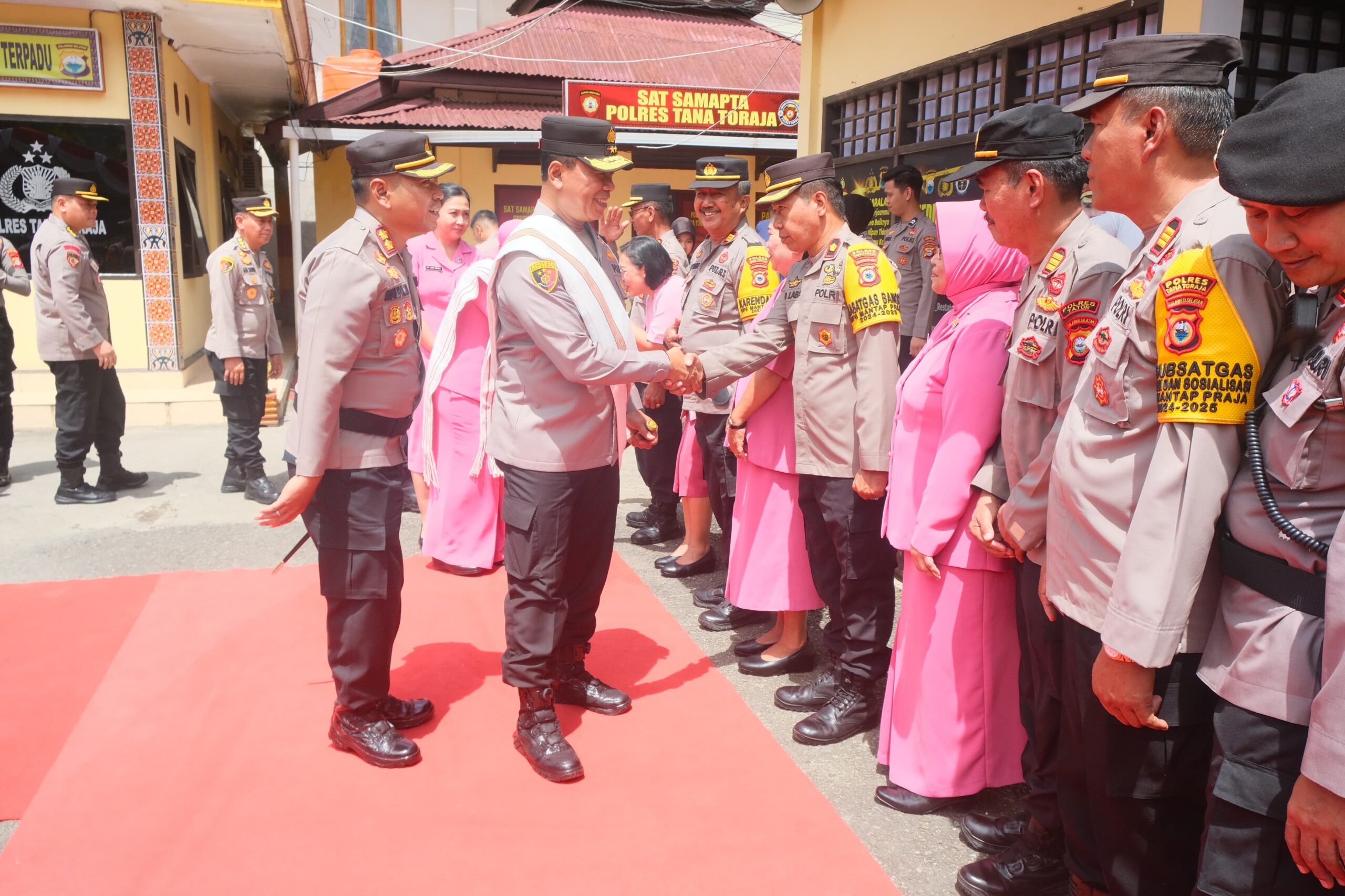 Kunjungan ini disambut langsung oleh Kapolres Tana Toraja AKBP Malpa Malacoppo, S.H., S.I.K., M.I.K., beserta jajaran dengan prosesi pengalungan bunga dan jajar kehormatan. Acara ini turut dihadiri oleh Para Pejabat Utama (PJU) Polres Tana Toraja dan Forkopimda Kabupaten Tana Toraja.