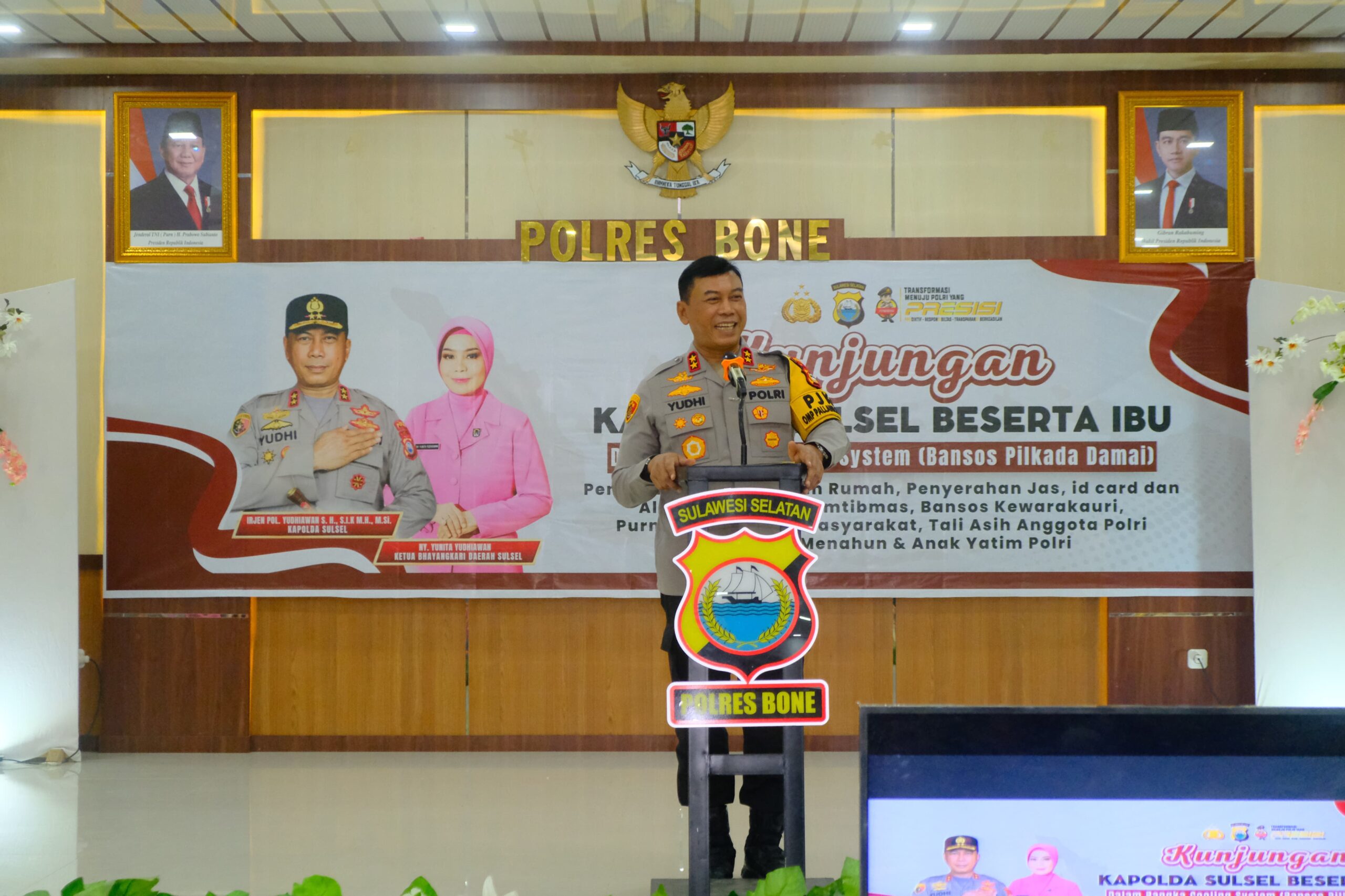 Kapolda Sulawesi Selatan, Irjen Pol. Yudhiawan S.H., S.I.K., M.H., M.Si., melaksanakan kunjungan kerja di Polres Bone dalam rangka program Cooling System Bansos Pilkada Damai 2024. , Selasa (29/10/24). Dalam kunjungan tersebut, Kapolda Sulsel didampingi Ketua Bhayangkari Daerah Sulawesi Selatan, Ny. Yunita Yudhiawan, dan Ustad Das’ad Latif.