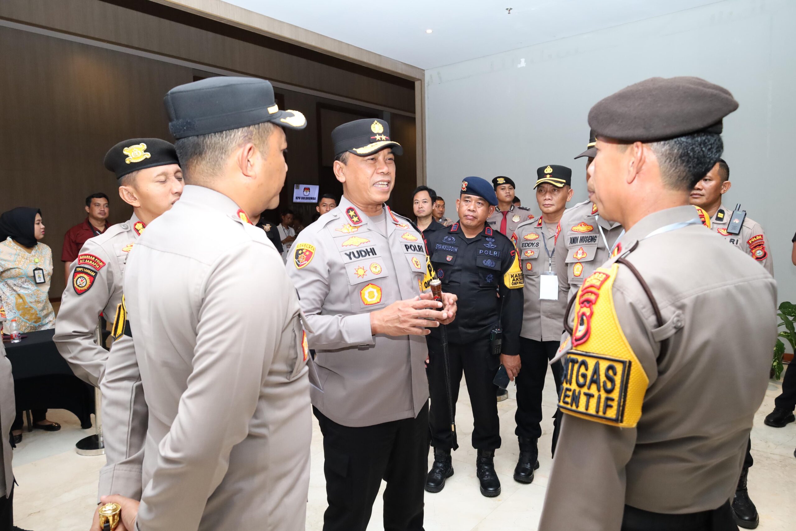Kepala Kepolisian Daerah Sulawesi Selatan, Irjen Pol. Yudhiawan, S.H., S.I.K., M.H., M.Si., bersama Wakapolda Sulsel, Brigjen Pol. Nasri, S.I.K., M.H., dan Sejumlah Pejabat Utama Polda Sulsel meninjau secara langsung kesiapan personel pengamanan di Hotel Gammara Makassar, Kamis malam (15/11/2024).