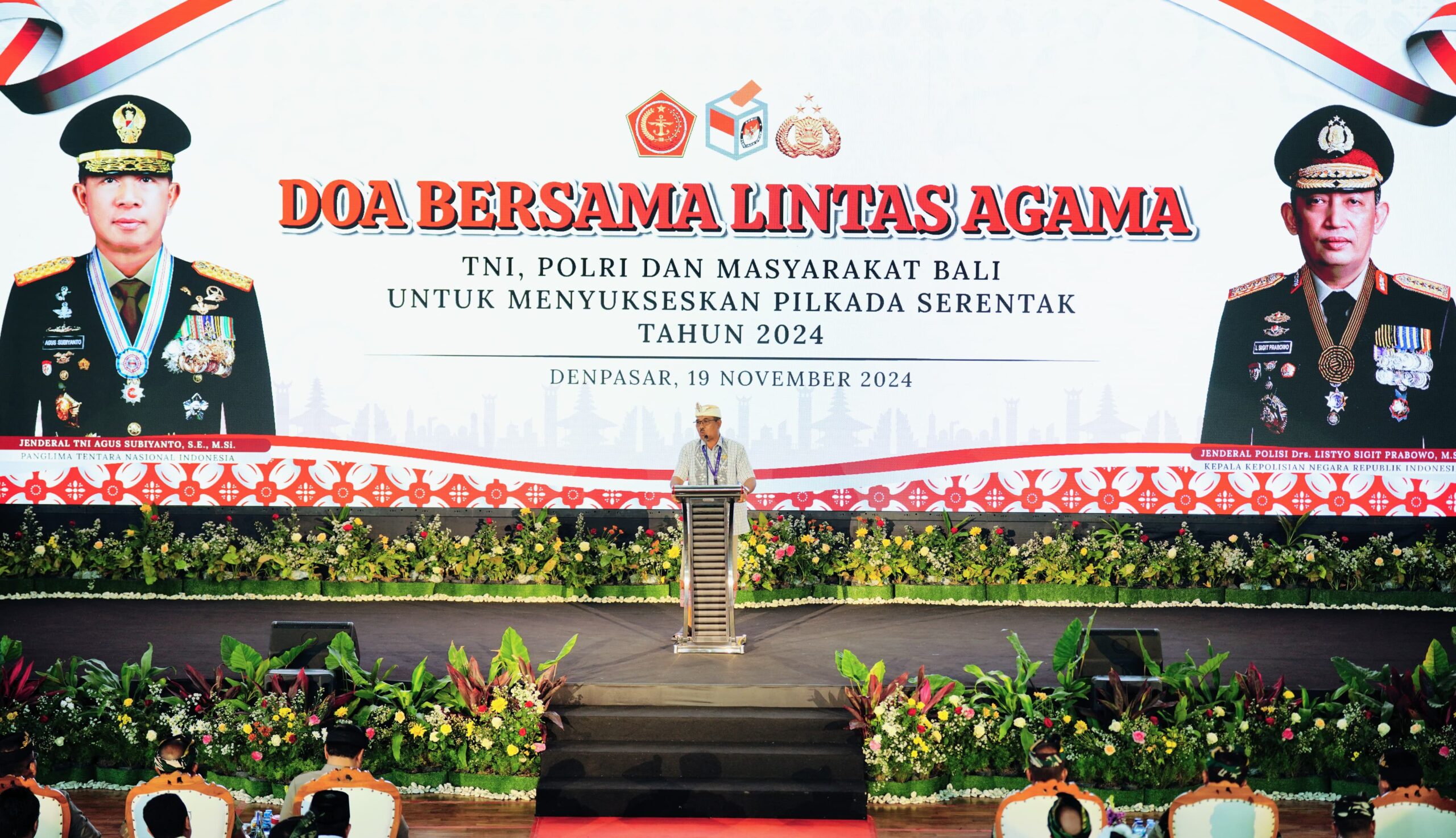 Acara doa bersama lintas agama bersama TNI-Polri dan masyarakat Bali ini digelar di GOR Yudomo, Praja Raksaka Kepaon, Denpasar, Bali, Selasa (19/11/2024). Hadir pula Panglima TNI Jenderal Agus Subiyanto.