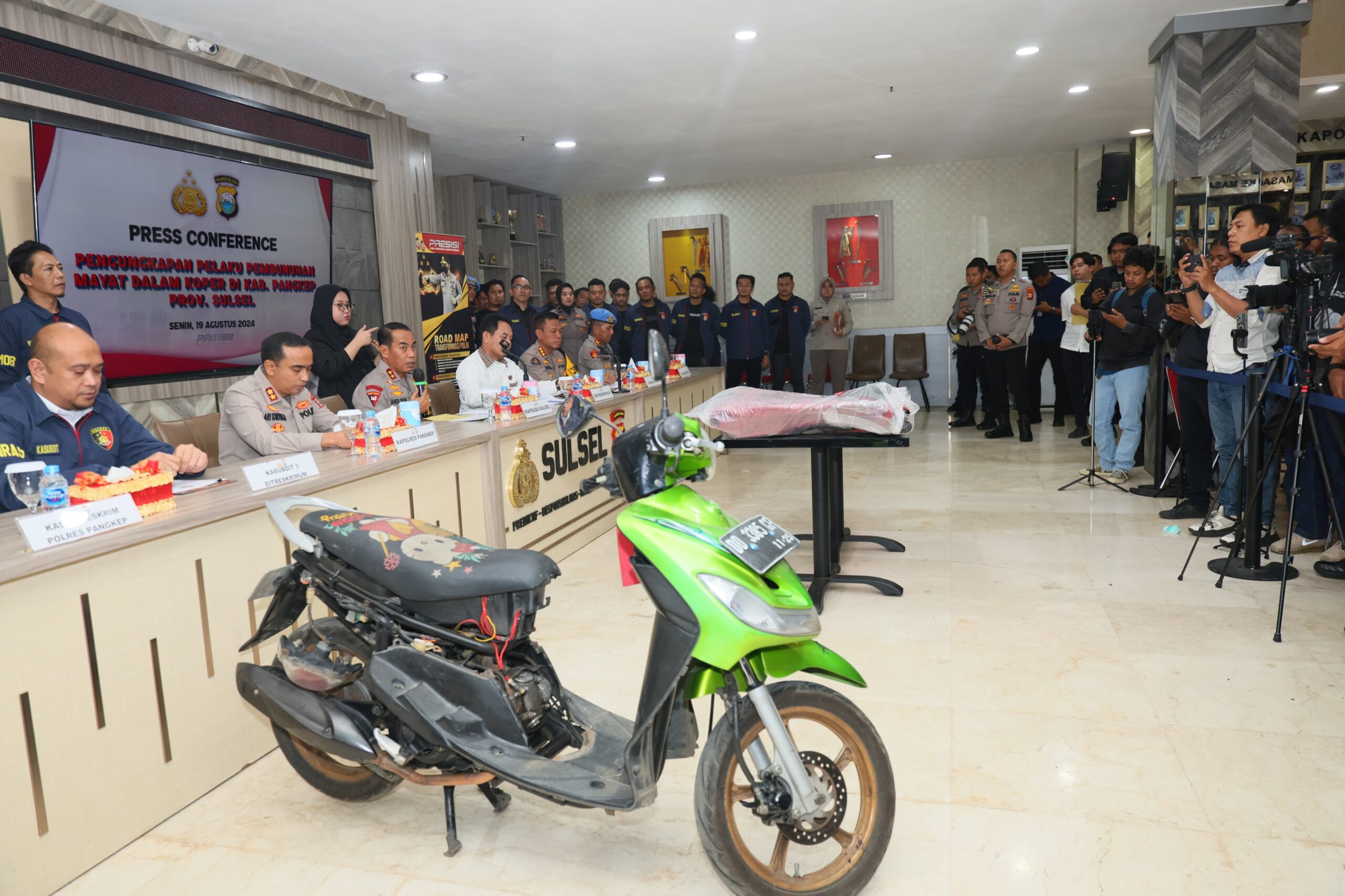 Polda Sulsel menggelar Konsferensi Pers Pengungkapan kasus kematian RML (49), Perempuan yang jasadnya ditaruh dalam koper dan ditemukan di rumah kontrakan milik warga bernama Aisyah tepatnya di Jl. Pelelangan Ikan, Jagong, Kab. Pangkep, 10 Agustus 2024 lalu.
