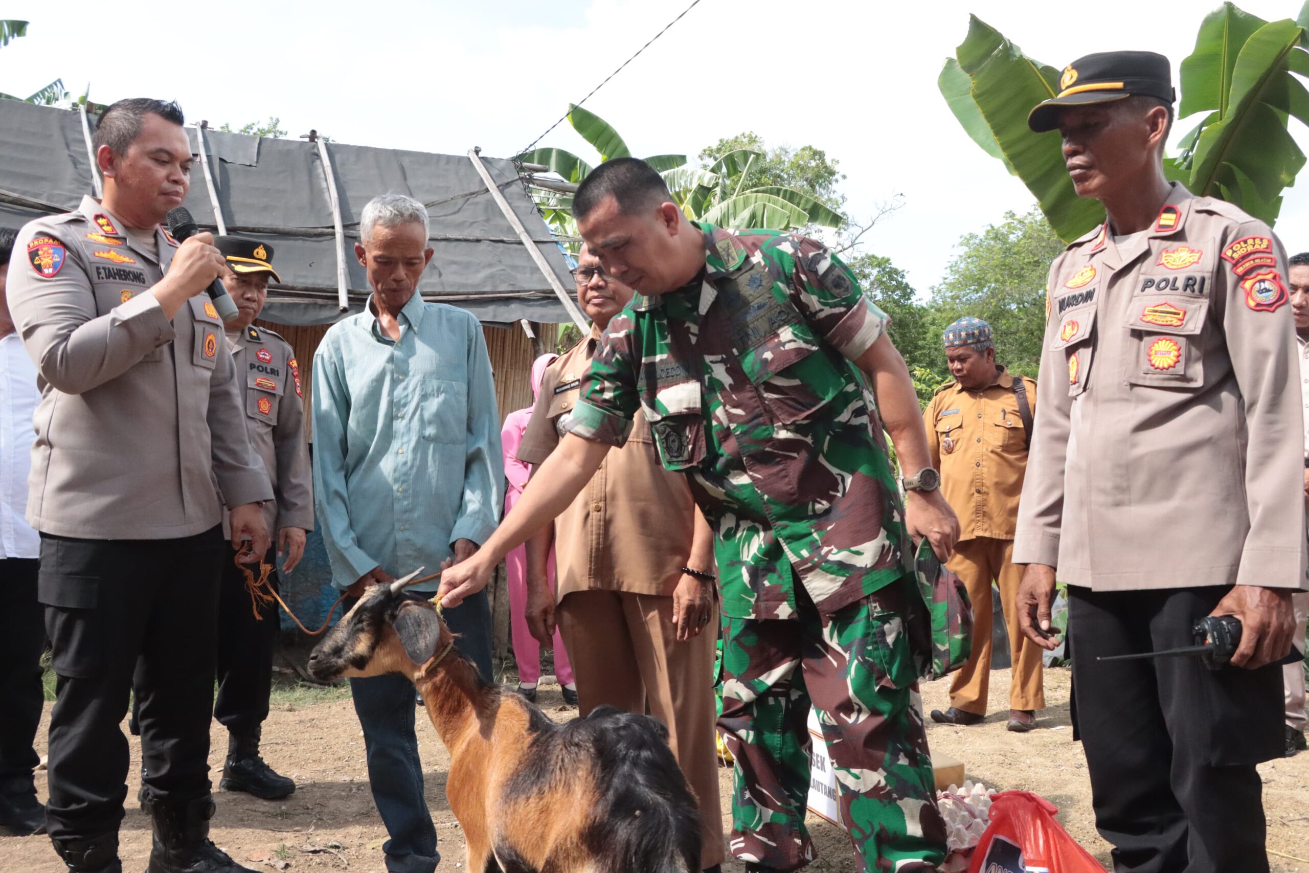 Kepala Kepolisian Resort Sidrap Akbp Fantry Taherong menyerahkan bantuan seekor kambing dan sembako kepada Pak Amir (50), warga yang tinggal di rumah kurang layak di Kelurahan Bilokka Kecamatan Panca Lautang Kabupaten Sidrap, Selasa (18/11/25) siang