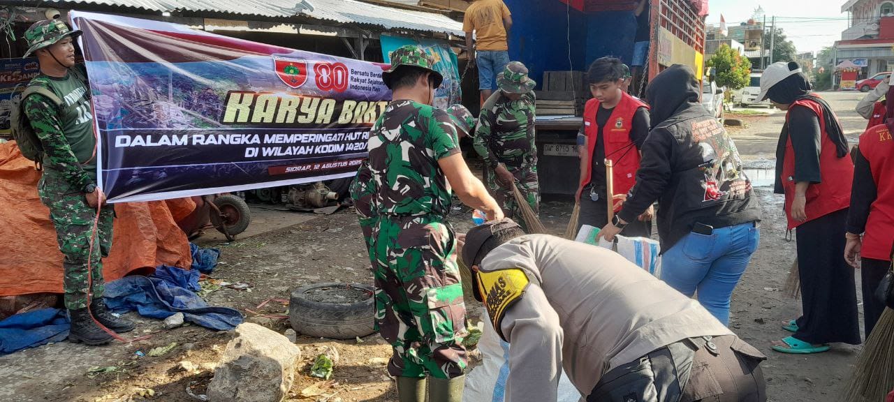 Sidrap, – Dalam rangka memeriahkan Hari Ulang Tahun Kemerdekaan Republik Indonesia ke-80, Kodim 1420/Sidrap bekerja sama dengan Pemerintah Kabupaten Sidrap, Polres Sidrap, mahasiswa Kuliah Kerja Nyata (KKN) Universitas Hasanuddin Makassar, serta masyarakat setempat melaksanakan kegiatan karya bakti pembersihan di Pasar Sentral Pangkajene, Kelurahan Pangkajene, Kabupaten Sidrap, Selasa (12/08/2025)